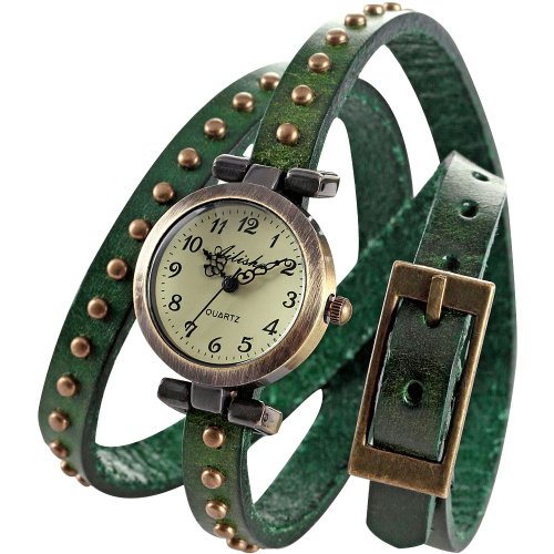 AMPM24 Vintage Green Leather Girl Lady Women Slim Wrap Long Bracelet Quartz Watch Gift WAA279