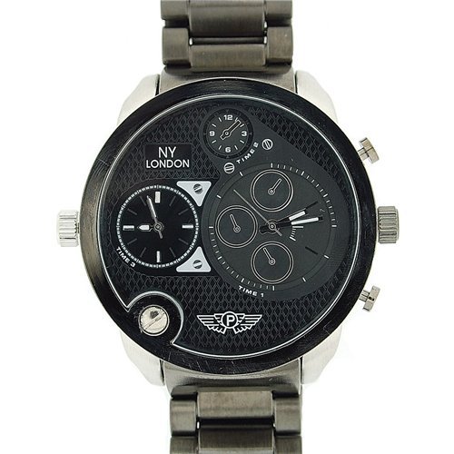 Prince London Gents Triple Time Zone Black Dial Gun Metal Strap Watch PI 3060